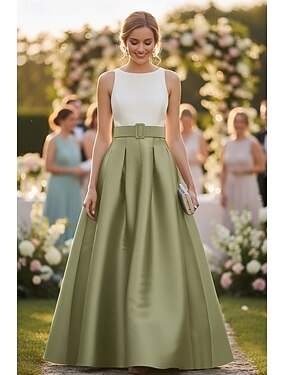 Linha A Longo Vestido de convidada de casamento Vestido formal Vestido de noite Vestido Para Mãe dos Noivos Sem Manga Barco Pescoço Scoop pescoço Elegante Noite Formal Cetim com Renda Faixa / Fita