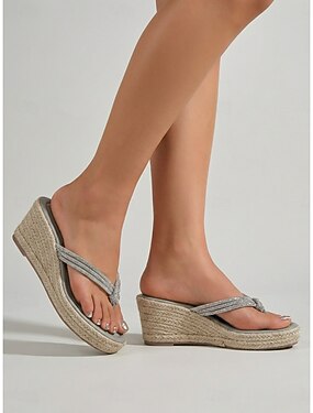 Sandálias femininas elegantes em tom cinza claro com plataforma espadrille, perfeitas para resorts ao ar livre e festas em jardins tropicais. Tiras de dedo com strass brilhantes e plataforma trançada,