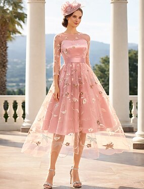 Linha A Até os Joelhos Vestidos de baile Floral Fada Meia Manga Decorado com Bijuteria Festa de Jardim Convidado do casamento Tule com Bordado Apliques