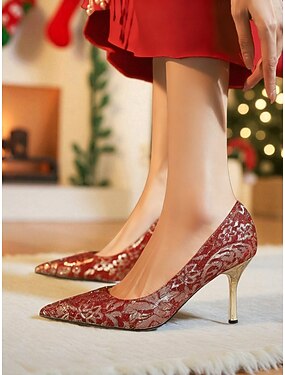 Sapatos de salto agulha femininos com bico fino e renda vermelha, elegantes sapatos de salto alto com glitter e salto dourado para festas de Natal &celebrações de feriados