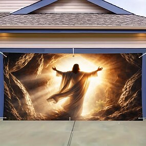 Cobertura de garagem de Páscoa com cena da ressurreição e Jesus na gruta do túmulo, decoração religiosa cristã com luz radiante, perfeita para celebrações ao ar livre e decoração da Semana Santa.
