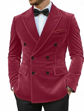 Blazer masculino de veludo, com fechamento na gola, para festas e uso casual, em cores sólidas (vermelho, azul, roxo), corte sob medida, abotoamento duplo com seis botões.