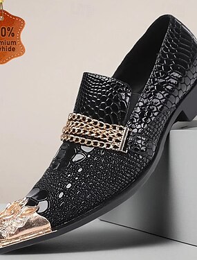 Mocassins masculinos pretos com estampa de crocodilo e detalhe de corrente, calçados slip-on modernos, ideais para eventos noturnos e ocasiões especiais.