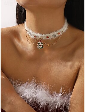 Colar choker natalino feminino, em pelúcia e liga metálica, com pingente de estrela vermelha e dourada, árvore de Natal com strass, acessório perfeito para festas de fim de ano.