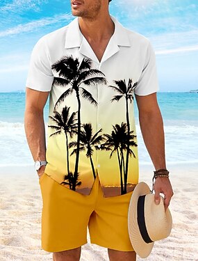 Homens Coqueiro 2pcs Conjuntos de camisas Camisa Social Manga Curta Calças curtas colar cubano Férias Havaiana Festa Casual Diário Impressão 3D Verão Rubi Vermelho Branco Amarelo