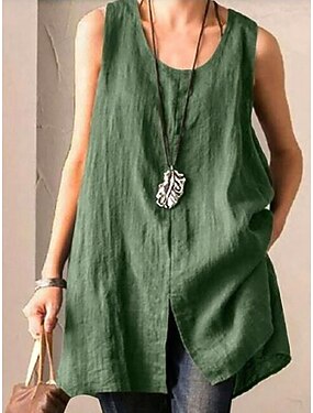 Mulheres Colete de algodão e linho Blusa Linho de algodão sintético Patchwork Tecido Vintage à moda Clássico Sem Manga Gola Redonda Tops longos Diário Feriado Para Noite Preto Verde Verão Primavera