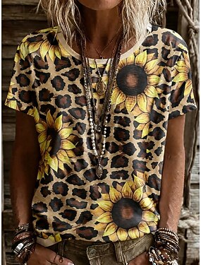 Mulheres Camiseta Imprimir Gráfico Animal Leopardo Vintage à moda Clássico Manga Curta Gola Redonda Decote Redondo Tops regulares Diário Final de semana Verde Claro Rosa Cáqui Verão Primavera Outono