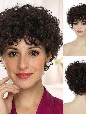 Peruca curta e cacheada castanha escura para mulheres - cachos espirais realistas e fechados com franja - peruca sintética volumosa estilo pixie cacheada