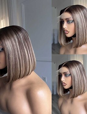 Peruca curta bob com cabelo humano, fecho 5x5, lace front 13x4, repartição central, cabelo brasileiro liso, loiro acinzentado, castanho, multicolorida, com baby hair, mechas/balayage, linha capilar