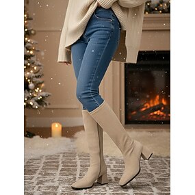 Botas femininas de camurça acima do joelho com fecho de zíper, salto bloco, confortáveis e elegantes para o inverno ou passeios casuais.