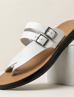 Sandálias masculinas brancas de dedo com fivela dupla, calçado casual de verão confortável para praia, resort e férias.