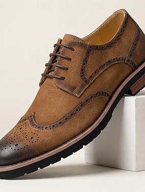 Sapatos sociais masculinos brogue marrons com bico wingtip, oxfords clássicos de amarrar para homens maduros, ideais para o escritório, casamentos, banquetes e eventos casuais elegantes.