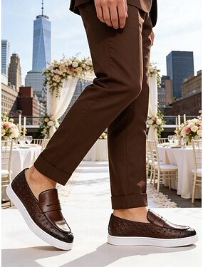 Mocassins masculinos casuais em couro marrom, com acabamento liso e ajuste confortável, estilo elegante e formal para casamentos, cultos religiosos e eventos formais.