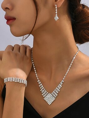 conjunto de joias de strass de luxo – colar de cristal prateado brilhante, pulseira e brincos pendentes para mulheres