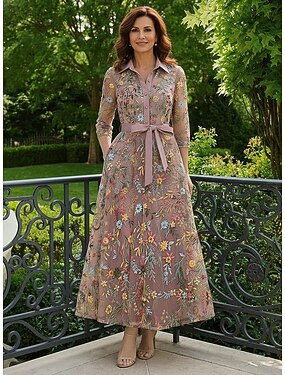 Linha A Vestidos Até o Tornozelo Longuette Vestido Coquetel Vestido de convidada de casamento Vestido Para Mãe dos Noivos Manga 3/4 Meia Manga Colarinho de Camisa Elegante Casual Formal Convidado do