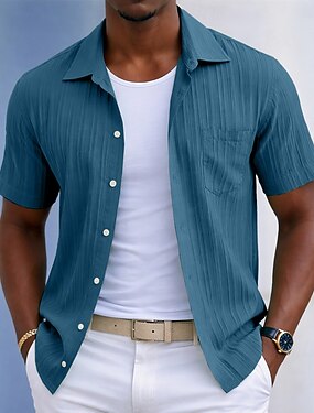 Homens Camisa Social Camisa casual camisa de praia camisa de botão Camisa Jacquard Preto Branco Verde Claro Vinho Azul Manga Curta Côr Sólida Tecido Linhas / Ondas Lapela Casual Streetwear Bolsos