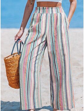 Mulheres Linho de algodão sintético Perna larga chinês Férias Moda Roupa de rua Comprimento total Cintura Alta Linhas / Ondas Bolsos Cintura elástica Estampado Confortável Conforto Macio Com Stretch