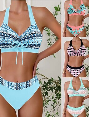 Bikini Feminino de 2 Peças Estampa Colorida Cheeky Sem Costas Férias Praia Decote Halter Sem Mangas