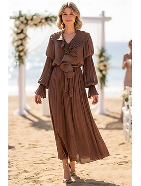 Linha A Até o Tornozelo Vestido de convidada de casamento Vestido Swing Vestidos para convidadas de casamento Elegante Vintage Manga Longa Decote V Festa de Jardim Convidado do casamento com Pregas