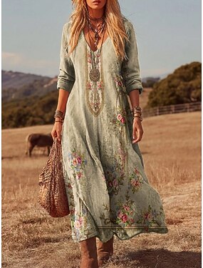 Mulheres Vestido Longo Vestidos Para o Verão Vestido de verão Férias Casual Boho Diário Ajuste Largo Gráfico Bloco de cor Manga Longa Decote V Cinzento Primavera Outono