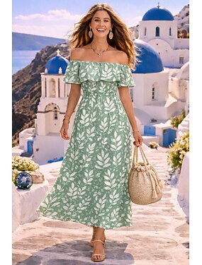 Mulheres Vestido Longo Vestido Boho Vestidos Para o Verão Vestido casual vestido étnico Elegante Boêmia Férias Praia Feriado Encontro Ajuste Largo Floral Manga Curta Ombro a Ombro Azul Verde Verão