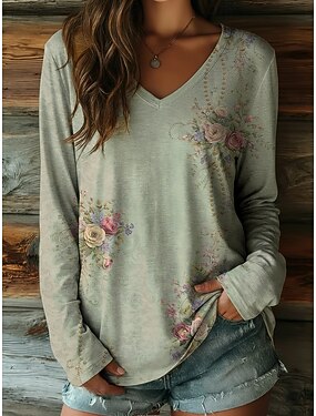 Camiseta Feminina de Manga Longa Gola em V Manga Longa Tunica Ombre Casual Tops Regulares Impressão Diária Azul Marinho Primavera Outono Pré-outono