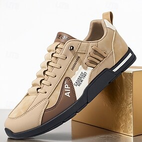 Tênis masculino bege casual com cadarço, leve e confortável para caminhada, calçado moderno e estiloso para uso diário, viagens, deslocamentos, lazer ao ar livre, atividades de fim de semana e um visual casual contemporâneo.