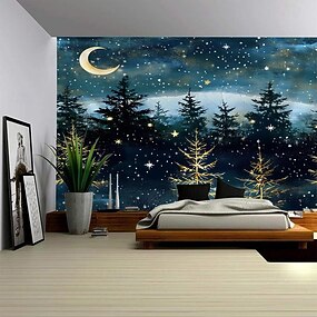 Tapeçaria digital moderna com paisagem de floresta e céu estrelado, ideal para pendurar na parede em quartos, salas de estar, dormitórios e para decoração de casa. Fundo fotográfico para fotos.