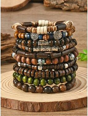Conjunto de pulseiras masculinas boêmias de madeira com contas, 10 peças, pulseiras elásticas empilháveis com contas para férias na praia, uso casual diário, viagens e festivais.