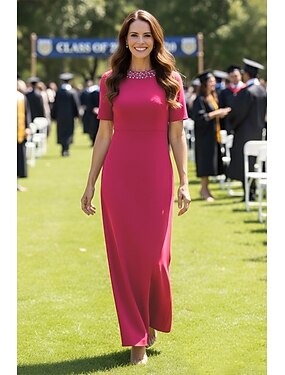 Tubinho Longo Vestido formal Vestido Para Mãe dos Noivos Manga Curta Gola Redonda Elegante Simples Formal Convidado do casamento Festa de Casamento Crepe Esticado com Miçangas Cor Única