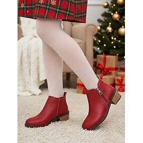 Botas femininas vermelhas com zíper no tornozelo - botas estilosas de couro sintético com salto grosso para o Natal, uso casual e profissional
