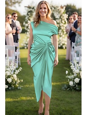 Tubinho Até o Tornozelo Vestido de festa Vestido Coquetel Vestido de convidada de casamento Vestido Para Mãe dos Noivos Manga Curta Assimétrico Elegante Vintage Convidado do casamento Cetim com Pregas