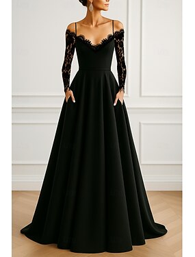 Linha A Longo Vestidos de noite Vestido de Baile Vestido formal Elegante Manga Longa Ombro a Ombro Casamento Formal Bolsos Cetim com Pregas