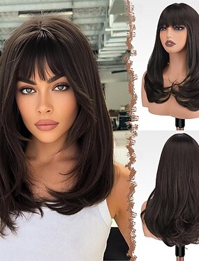 Peruca longa com franja, sintética, de aparência natural, com camadas e cabelo liso, ideal para uso diário e festas. 45 cm (18 polegadas), cor castanha.