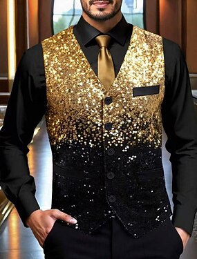 Homens Colete Gilet Férias Festa O negócio Moda Casual Primavera Outono Bolsos Botões Paetês Poliéster Confortável Bloco de cor Comum 1 Botão Decote V Normal Dourado Colete