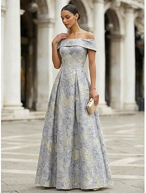 Linha A Longo Vestidos de noite Elegante Vintage Floral Manga Curta Ombro a Ombro Festa de Jardim Casamento Bolsos Jacquard Costas Degagê com Flores 3D