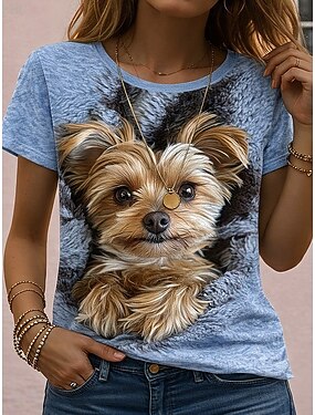 Mulheres Camiseta Imprimir Gráfico Animal Cachorro Vintage à moda Clássico Manga Curta Gola Redonda Decote V Tops regulares Casual Diário Azul Branco / azul Preto Amarelo Cáqui Verão Primavera