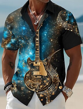 Homens Céu estrelado Guitarra Instrumento Musical Camisa Social camisa de botão Manga Curta Artistíco Vintage retrô Festival de Música Feriado Verão Primavera Aberto para a Lateral Impressão 3D