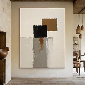 Pintura a óleo geométrica abstrata grande em tom bege cremoso, estilo moderno wabi-sabi, arte de parede minimalista em marrom e preto, pintura texturizada bege.