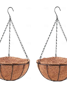 Vasos suspensos para plantas externas (pacote com 2, 30 cm) com forro de fibra de coco, suporte de arame metálico redondo para plantas, gancho com corrente para varanda, jardim, sacada, decoração