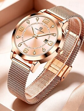 Relógio feminino em tom ouro rosa, à prova d'água, com pulseira de malha de aço inoxidável, elegante mostrador com efeito raios de sol e data. &Relógio de pulso com diamantes, ideal para ocasiões