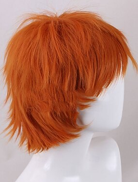 Peruca curta laranja com pontas viradas para fora, perfeita para cosplay de aventureiro(a) do oceano.
