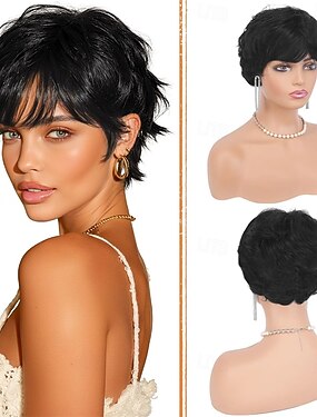 Perucas pretas estilo pixie para mulheres - corte de cabelo curto e natural em camadas, peruca sintética resistente ao calor para uso diário.