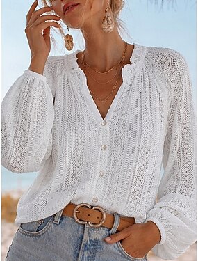 Mulheres Camisa Social Camisa Pointelle Topo de ilhó Blusa Renda Tecido à moda Básico Clássico Manga Curta Decote V Tops regulares Casual Diário Praia Branco Verão Primavera