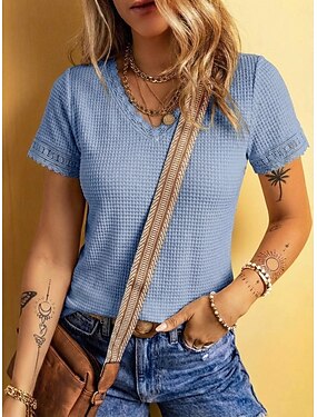 Mulheres Camiseta Waffle Top de emenda de renda T-shirt Elegante à moda Manga Curta Decote V Tops regulares Casual Para Noite Roupas de férias Azul Preto Branco Verde Damasco Verão Primavera