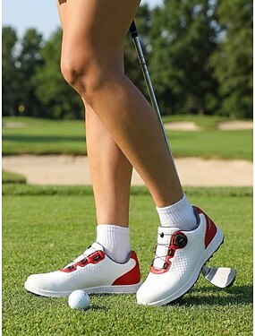 Sapatos de golfe profissionais femininos nas cores vermelho e branco, com sola antiderrapante com cravos - ajuste por disco para maior conforto e desempenho esportivo, ideais para golfe e atividades