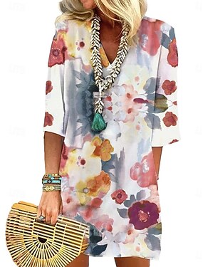 Mulheres Vestido no Joelho Vestido branco Vestido antigo Vestido casual Elegante Moda Moderno Ao ar livre Férias Para Noite Ajuste Largo Floral Meia Manga Decote V Branco Creme Verde Verão Primavera