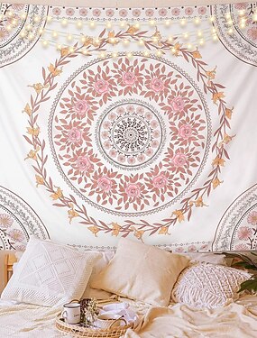 Tapeçaria de parede creme com mandala floral de rosas cor-de-rosa, flores rosa-pó, trepadeiras botânicas e padrão simétrico. Ideal para decoração de quarto, sala de estar, dormitório ou festas.