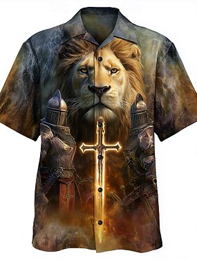 Homens Leão Cavaleiros Templários Cruz Camisa Social camisa de botão Camisa de acampamento Manga Curta Vintage retrô Feriado Casual / Diário Verão Primavera colar cubano Impressão 3D Laranja Cinzento
