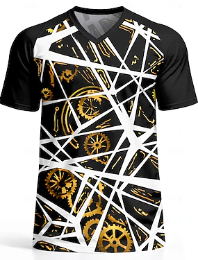 Camisa de futebol masculina preta e dourada com estampa abstrata de engrenagem, confeccionada em tecido de malha respirável de secagem rápida com proteção UPF50+, ideal para torcedores em torneios.